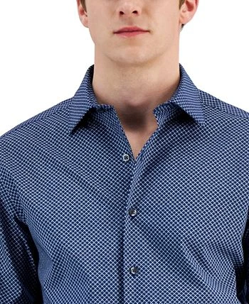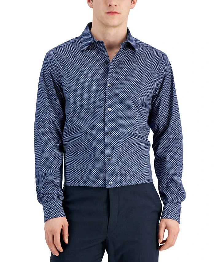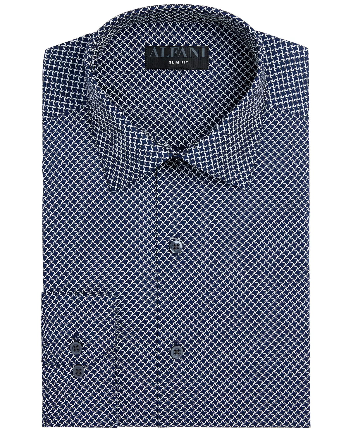 Continue the journey of perfecting your formal collection with this slim, puzzle-print dress shirt from Alfani, made from stain-resistant stretch fabric that moves with you every step of the way.