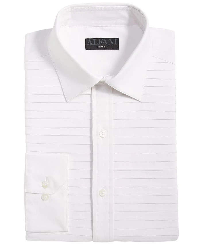 A luxurious look and refined style define this formal, pleated panel shirt from Alfani. It’s in a slim fit with stretch fabric that resists stains and wrinkles.