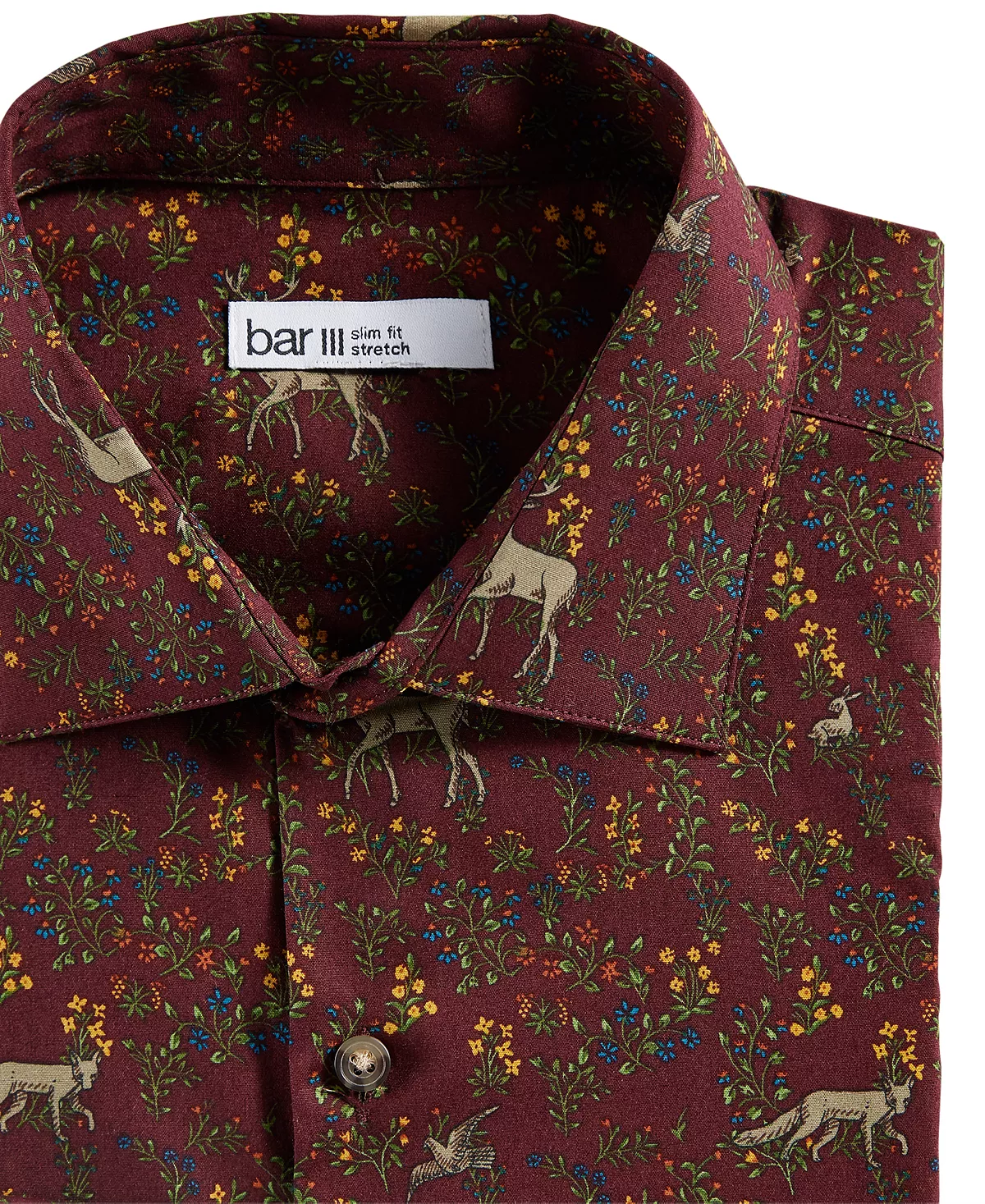 Bring eye-catching style to your business-ready wardrobe with the pattern of colorful flowers and forest animals printed on this slim-fit dress shirt from Bar III. Plus, it’s designed with the perfect length for wearing untucked.