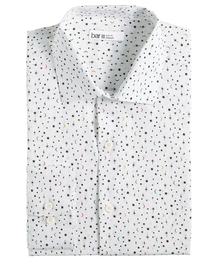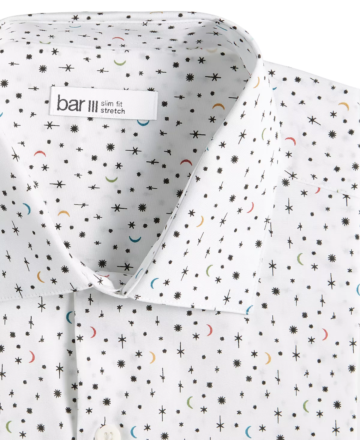 Build out your ever-growing collection of everyday looks with this all-cotton, slim-fit dress shirt from Bar III, designed from collar to hem with a dreamy moon and stars pattern.