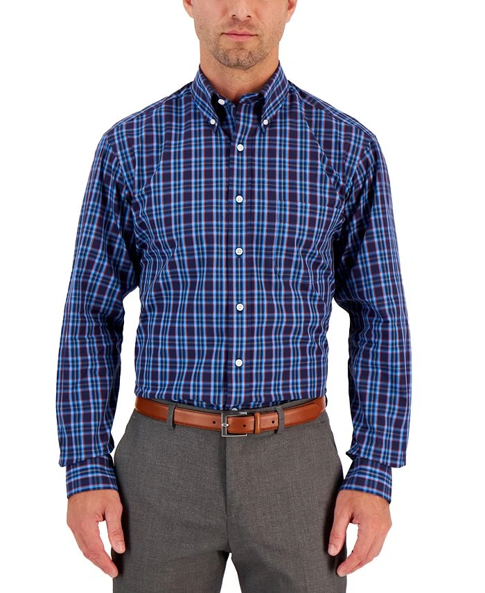 A classic button-down design and an allover plaid pattern make this wrinkle-resistant dress shirt from Club Room a perfect choice for making a great impression.