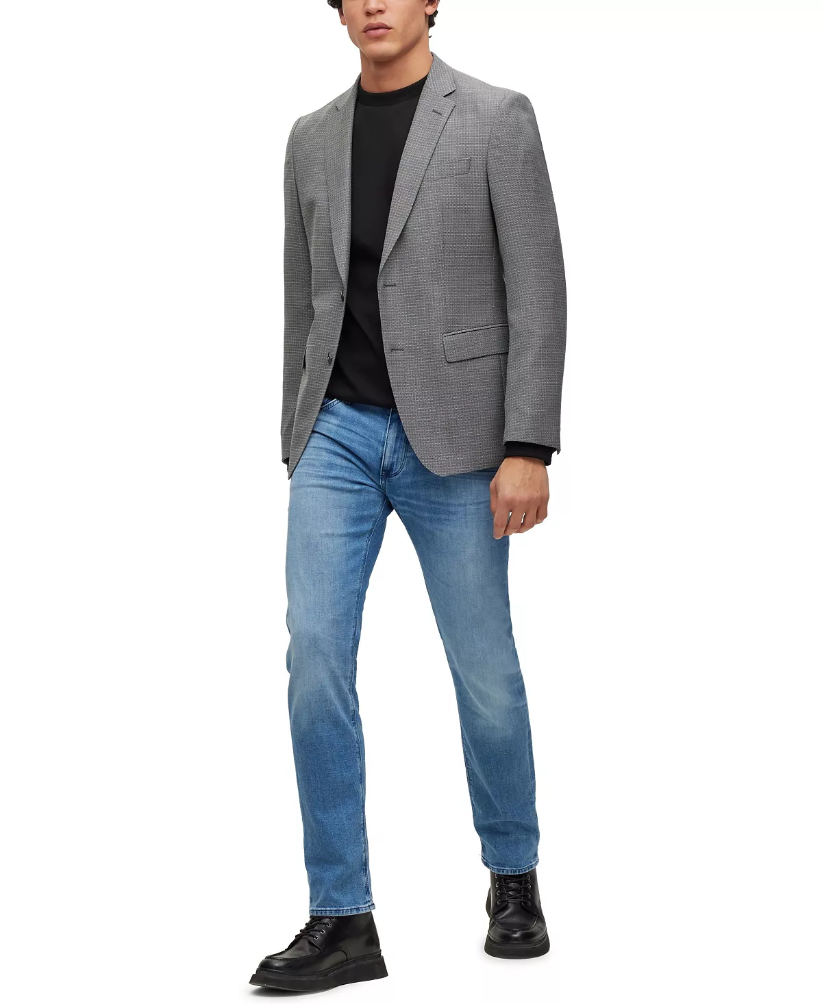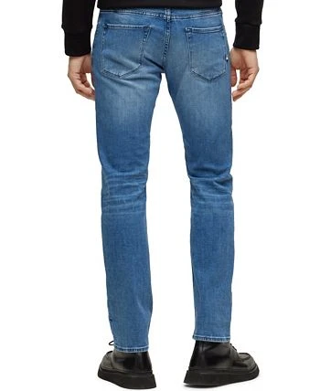 Blue jeans by BOSS Menswear. Crafted in denim with a cashmere touch for everyday luxury, these regular-rise jeans are trimmed with signature elements including a logo on the coin pocket. This pair is cut to a straight fit for an easy silhouette.