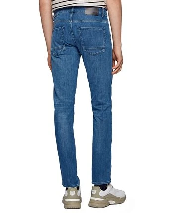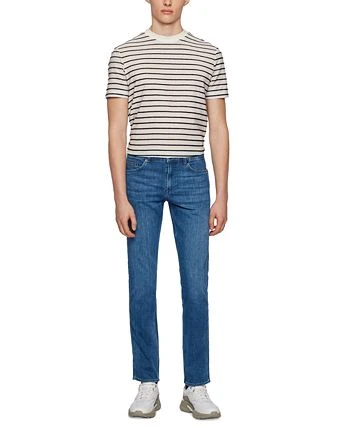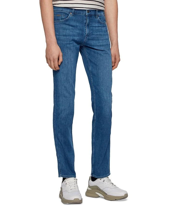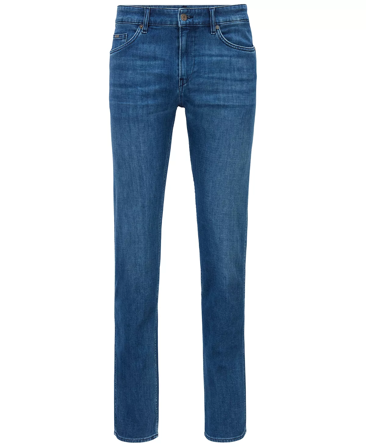 Regular-rise jeans in a mid-blue hue by BOSS Menswear. Cut to a slim fit with a straight leg, these jeans are crafted in Italian denim with a cashmere-like touch for a luxurious feel. A leather logo patch and hardware trims add authentic finishes to this pair.